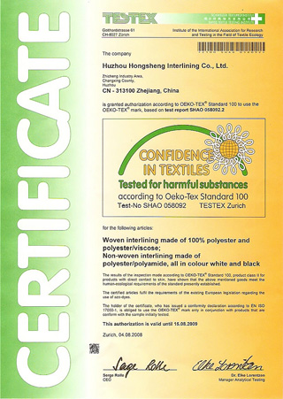 在中国的服装工业中,弘升衬布是安全和舒适的象征。弘升的特殊质量标准代表着经久不衰的高品质。公司通过了ISO9001:2000质量管理体系认证,2008年顺利通过了OEKO-TEX STANDARD100瑞士纺织品生态认证。 在提升服装的档次的同时, 弘升人更加注重产品的安全、可靠、环保和无公害性 。