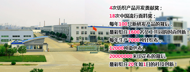 彩虹庄是国内首家定位“时尚针织面料”专业研究生产型企业,是绍兴市高新技术企业之一,国家印染产品开发基地,国家时装面料研发基地。其面料生产基地位于绍兴滨海工业区,占地面积193亩,内设绍兴彩虹庄针纺有限公司和浙江彩虹庄印染有限公司,总资产逾6亿,集面料织造、染整、印花于一体,打造面料全套产业链。